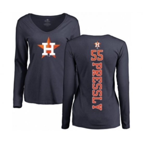 >Baseball Women's Houston Astros #55 Ryan Pressly Navy Blue Backer Long Sleeve T-Shirt