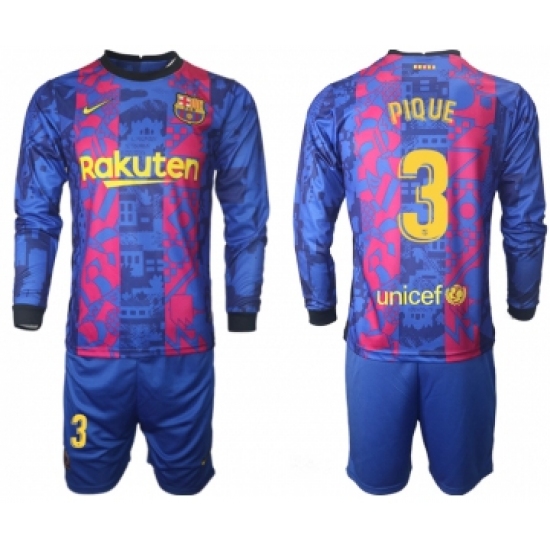 >Men 2021-2022 Club Barcelona Second away blue Long Sleeve 3 Soccer Jersey