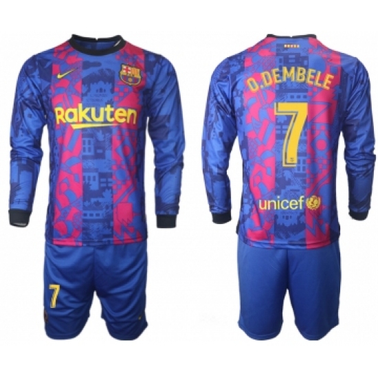 >Men 2021-2022 Club Barcelona Second away blue Long Sleeve 7 Soccer Jersey
