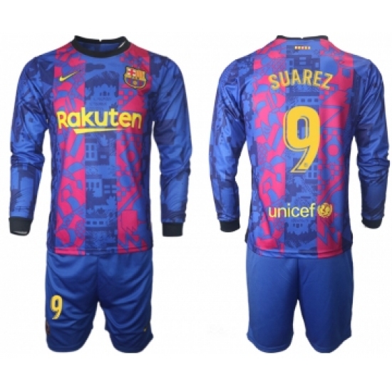 >Men 2021-2022 Club Barcelona Second away blue Long Sleeve 9 Soccer Jersey