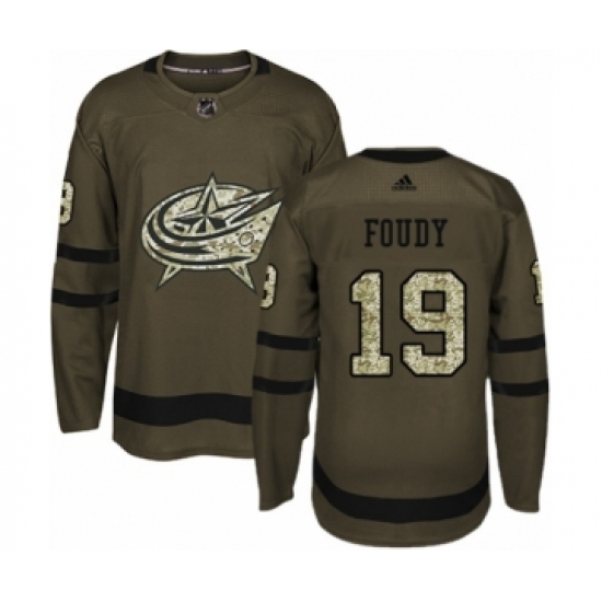 >Men's Adidas Columbus Blue Jackets #19 Liam Foudy Authentic Green Salute to Service NHL Jersey
