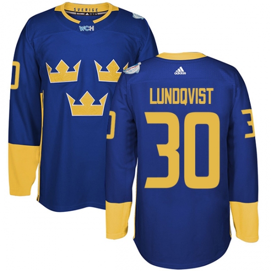 Men's Adidas Team Sweden #30 Henrik Lundqvist Premier Royal Blue Away 2016 World Cup of Hockey Jersey