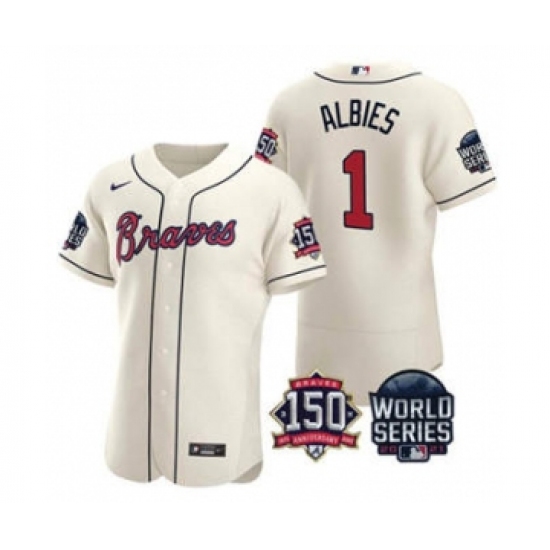 Men's Atlanta Braves #1 Ozzie Albies 2021 Cream World Series Flex Base With 150th Anniversary Patch Baseball Jersey