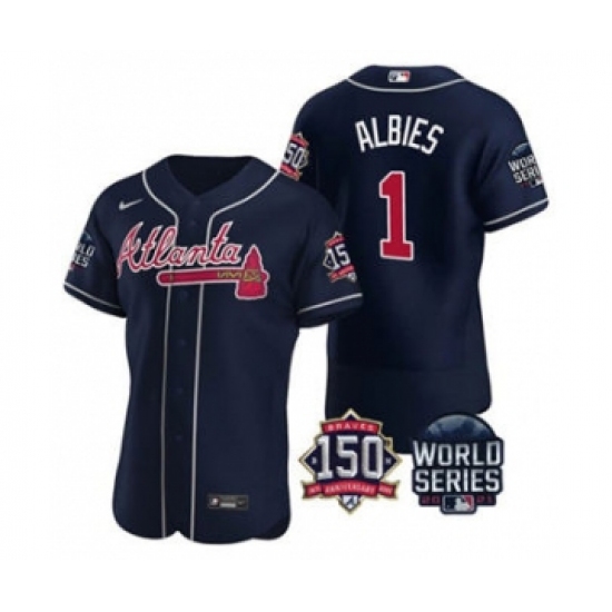 Men's Atlanta Braves #1 Ozzie Albies 2021 Navy World Series Flex Base With 150th Anniversary Patch Baseball Jersey