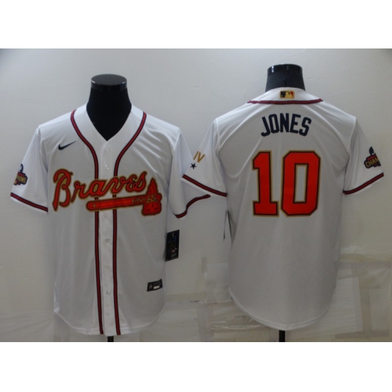 Men's Atlanta Braves #10 Chipper Jones 2022 White Gold World Series Champions Program Cool Base Stitched Baseball Jersey