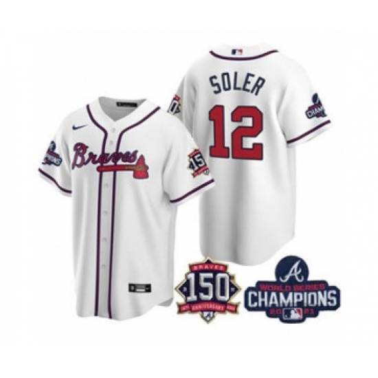 Men's Atlanta Braves #12 Jorge Soler 2021 White World Series Champions With 150th Anniversary Patch Cool Base Stitched Jersey