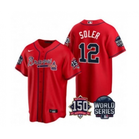 Men's Atlanta Braves #12 Jorge Soler 2021 White World Series With 150th Anniversary Patch Cool Base Stitched Jersey
