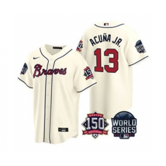Men's Atlanta Braves #13 Ronald Acuna Jr. 2021 Cream World Series With 150th Anniversary Patch Cool Base Baseball Jersey