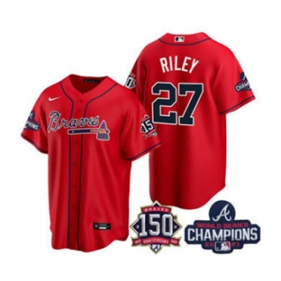Men's Atlanta Braves #27 Austin Riley 2021 Red World Series Champions With 150th Anniversary Patch Cool Base Stitched Jersey