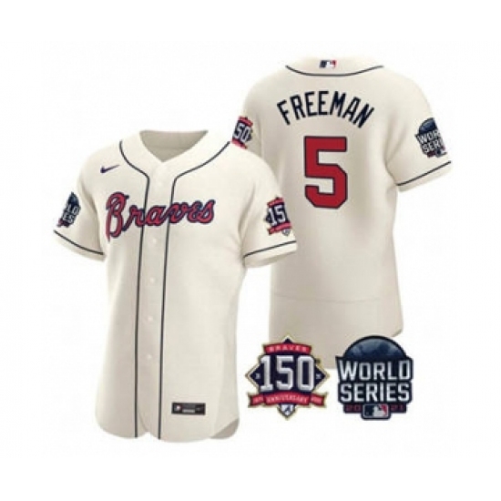 Men's Atlanta Braves #5 Freddie Freeman 2021 Cream World Series With 150th Anniversary Patch Cool Base Baseball Jersey