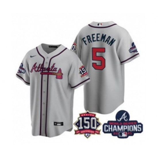 Men's Atlanta Braves #5 Freddie Freeman 2021 Gray World Series Champions With 150th Anniversary Patch Cool Base Stitched Jersey