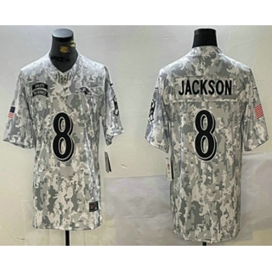 >Men's Baltimore Ravens #8 Lamar Jackson Arctic Camo 2024 FUSE Salute to Service Limited Stitched Jersey