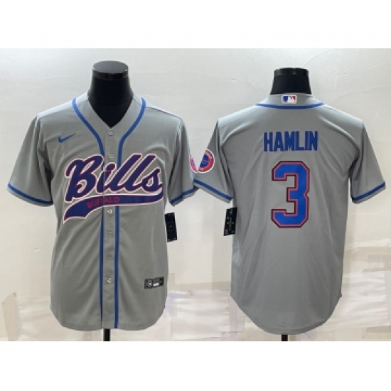 >Men's Buffalo Bills #3 Damar Hamlin Grey With Patch Cool Base Stitched Baseball Jersey