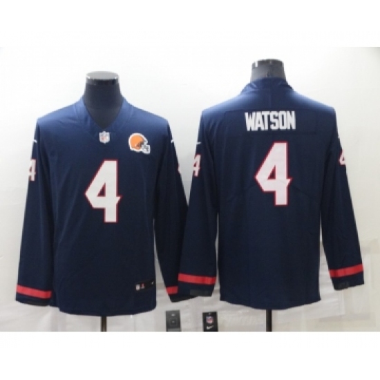 >Men's Cleveland Browns #4 Deshaun Watson Nike Navy Blue Therma Long Sleeve Limited Jersey