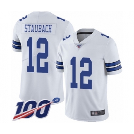 >Men's Dallas Cowboys #12 Roger Staubach White Vapor Untouchable Limited Player 100th Season Football Jersey