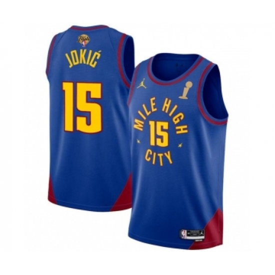 >Men's Denver Nuggets #15 Nikola Jokic Blue 2023 Finals Champions Statement Edition Stitched Basketball Jersey
