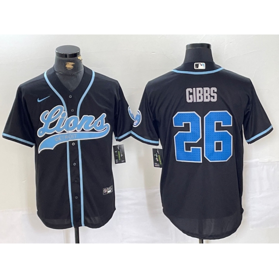 >Men's Detroit Lions #26 Jahmyr Gibbs Black With Cool Base Stitched Baseball Jersey