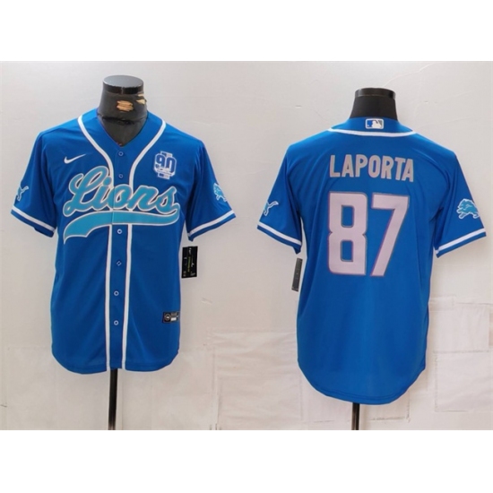 Men's Detroit Lions #87 Sam LaPorta Blue With 90th Anniversary Cool Base Stitched Baseball Jersey