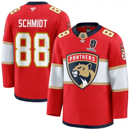 >Men's Florida Panthers #88 Nate Schmidt Red Home 2025 Stanley Cup Champions Stitched Jersey
