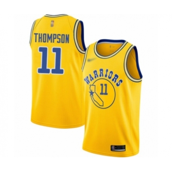 >Men's Golden State Warriors #11 Klay Thompson Authentic Gold Hardwood Classics Basketball Jersey