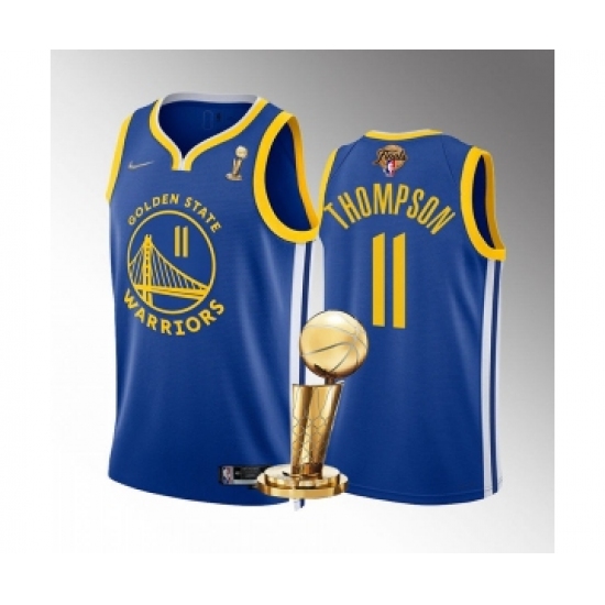 >Men's Golden State Warriors #11 Klay Thompson Royal 2022 NBA Finals Champions Stitched Jersey