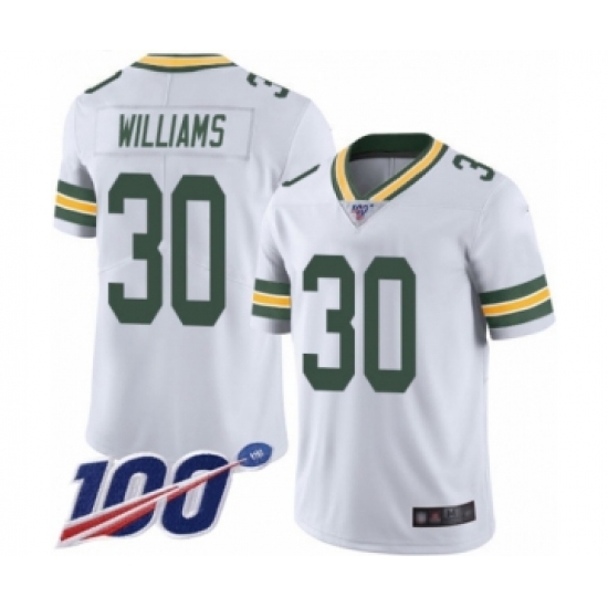 >Men's Green Bay Packers #30 Jamaal Williams White Vapor Untouchable Limited Player 100th Season Football Jersey