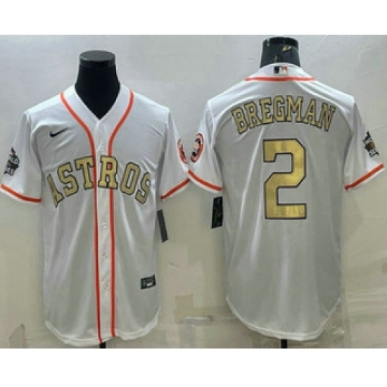 >Men's Houston Astros #2 Alex Bregman White Gold 2022 World Series Champions Stitched Cool Base Nike Jersey