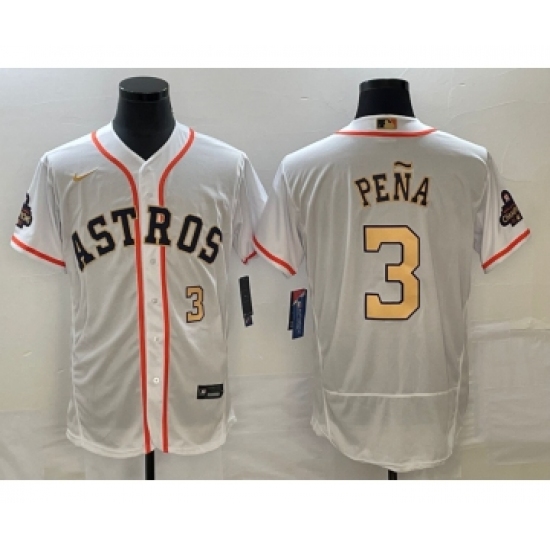 >Men's Houston Astros #3 Jeremy Pena Number 2023 White Gold World Serise Champions Flex Base Stitched Jersey1
