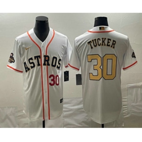 >Men's Houston Astros #30 Kyle Tucker Number 2023 White Gold World Serise Champions Cool Base Stitched Jerseys