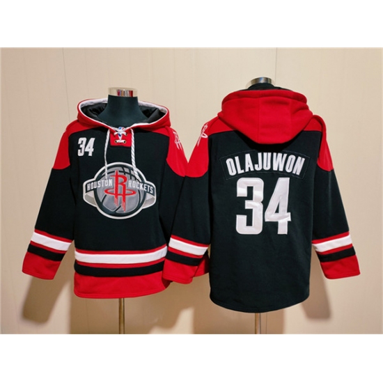 Men's Houston Rockets #34 Hakeem Olajuwon Black Red Lace-Up Pullover Hoodie