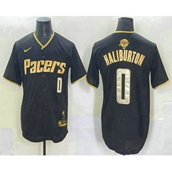 >Men's Indiana Pacers #0 Tyrese Haliburton Black Gold 2025 Finals Vapor Stitched Baseball Jersey