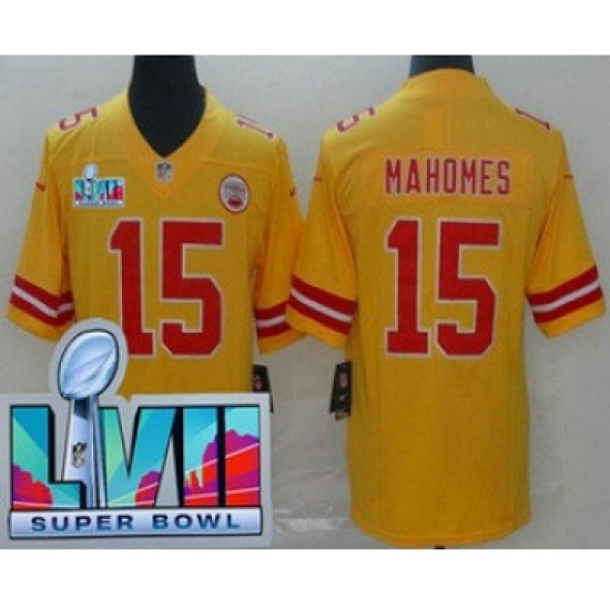 >Men's Kansas City Chiefs #15 Patrick Mahomes Limited Yellow Inverted Super Bowl LVII Vapor Jersey