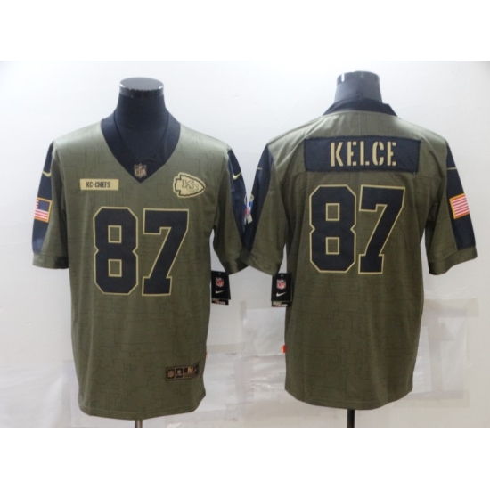 >Men's Kansas City Chiefs #87 Travis Kelce Nike Olive 2021 Salute To Service Limited Player Jersey