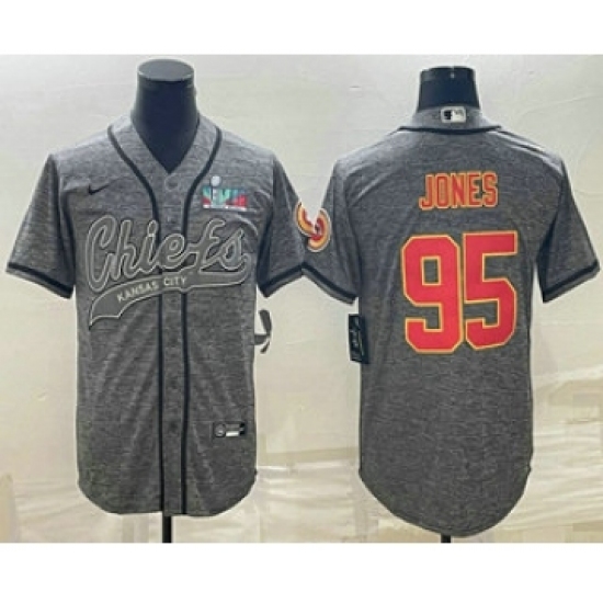 >Men's Kansas City Chiefs #95 Chris Jones Grey With Super Bowl LVII Patch Cool Base Stitched Baseball Jersey