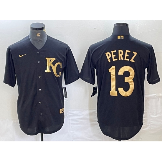 Men's Kansas City Royals #13 Salvador Perez Black Gold Cool Base Stitched Jersey