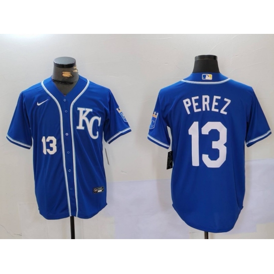Men's Kansas City Royals #13 Salvador Perez Number Blue KC Cool Base Stitched Jersey