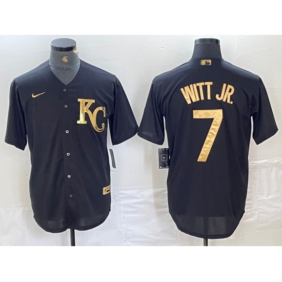 Men's Kansas City Royals #7 Bobby Witt Jr Black Gold Cool Base Stitched Jersey