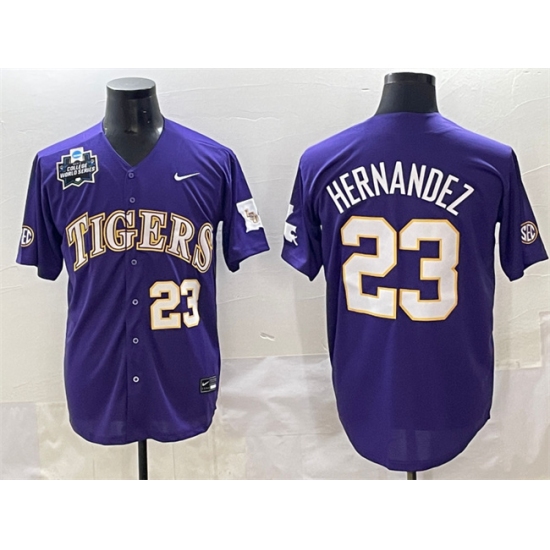 Men's LSU Tigers #23 Luis Hernandez Purple 2025 World Series & SEC Patch Stitched Baseball Jersey