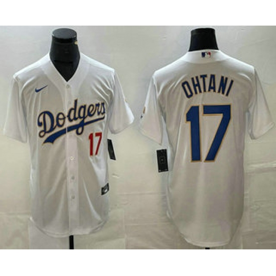 >Men's Los Angeles Dodgers #17 Shohei Ohtani Number White Gold Championship Stitched Cool Base Nike Jersey