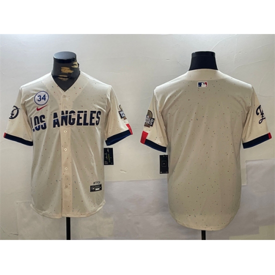 >Men's Los Angeles Dodgers Blank Cream 2024 World Series With No. 34 Limited Stitched Baseball Jersey