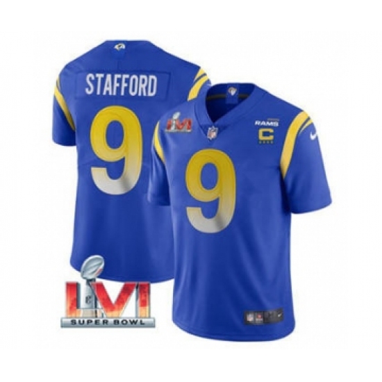 >Men's Los Angeles Rams #9 Matthew Stafford 2022 Royal With C Patch Super Bowl LVI Vapor Limited Jersey