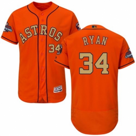 >Men's Majestic Houston Astros #34 Nolan Ryan Orange Alternate 2018 Gold Program Flex Base Authentic Collection MLB Jersey