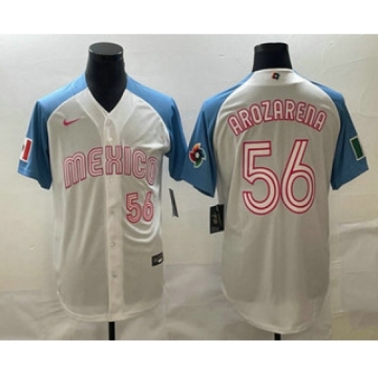 >Men's Mexico Baseball #56 Randy Arozarena Number 2023 White Blue World Classic Stitched Jersey
