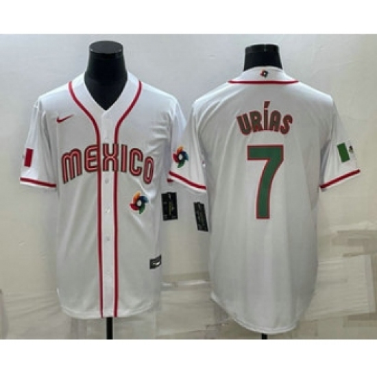 Men's Mexico Baseball #7 Julio Urias 2023 White Blue World Baseball Classic Stitched Jersey