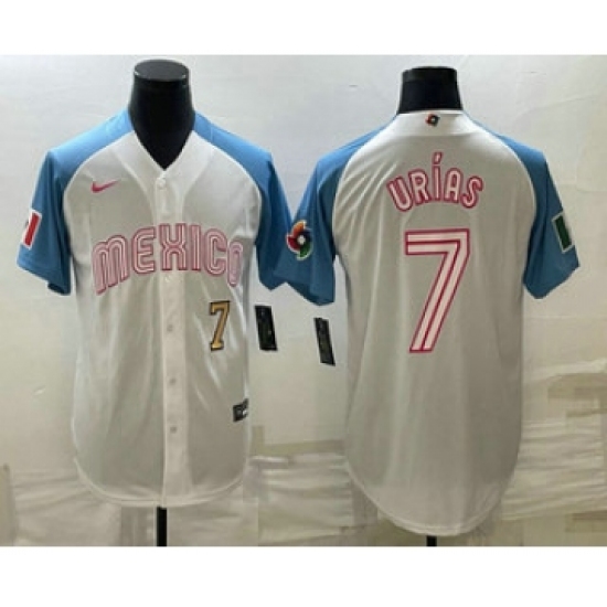 Men's Mexico Baseball #7 Julio Urías 2023 White Blue World Baseball Classic Stitched Jersey