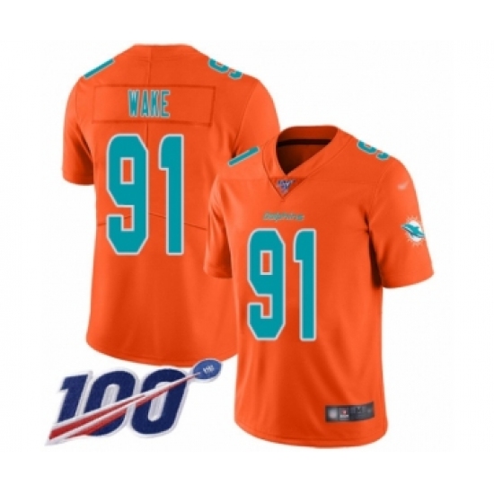 >Men's Miami Dolphins #91 Cameron Wake Limited Orange Inverted Legend 100th Season Football Jersey