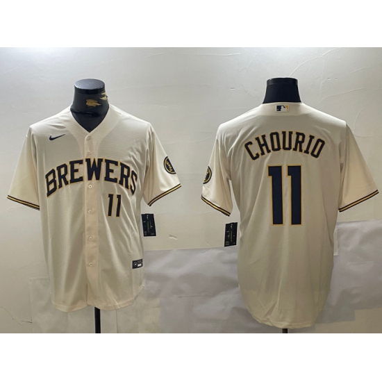 Men's Milwaukee Brewers #11 Jackson Chourio Number Cream Stitched Cool Base Nike Jersey