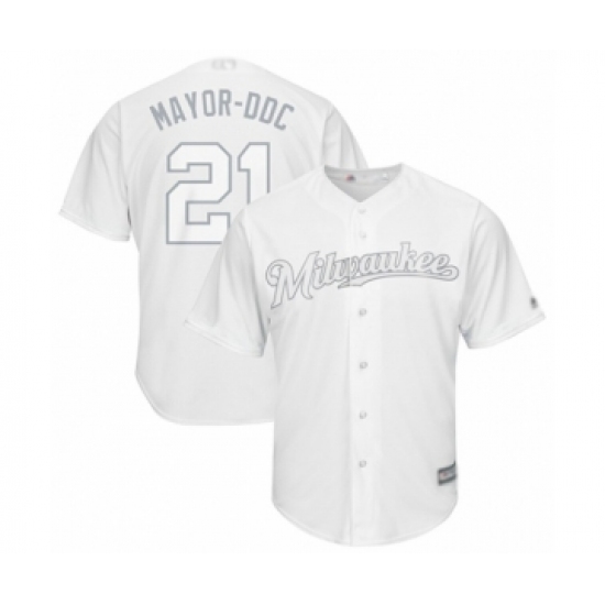 >Men's Milwaukee Brewers #21 Travis Shaw Mayor-DDC Authentic White 2019 Players Weekend Baseball Jersey