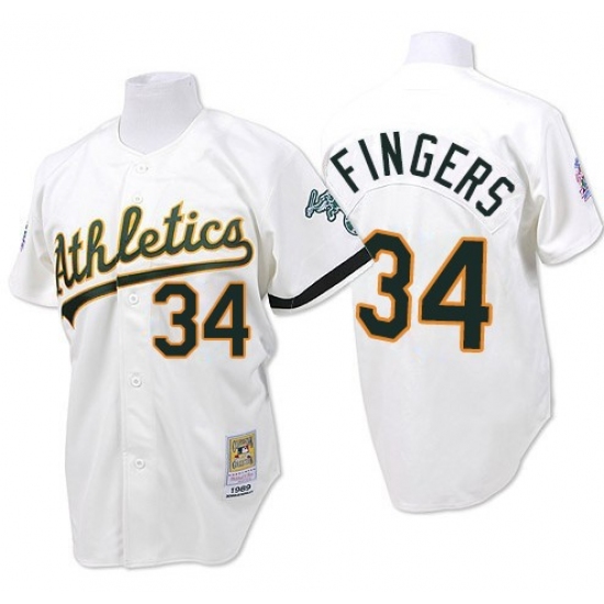 Men's Mitchell and Ness Oakland Athletics #34 Rollie Fingers Authentic White Throwback MLB Jersey