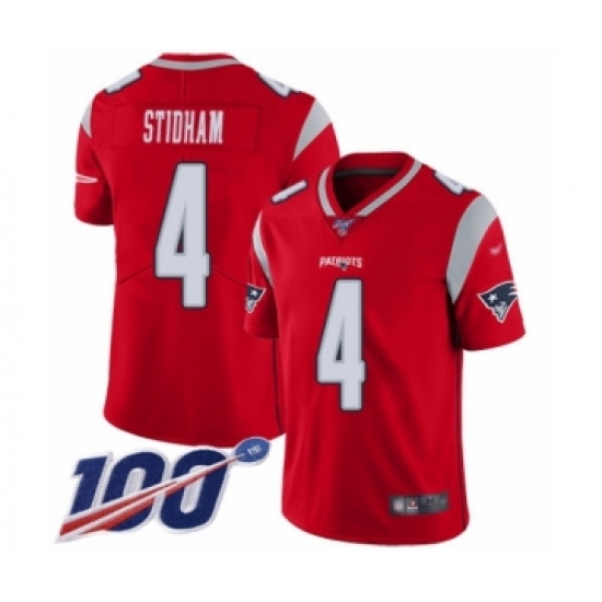 >Men's New England Patriots #4 Jarrett Stidham Limited Red Inverted Legend 100th Season Football Jersey